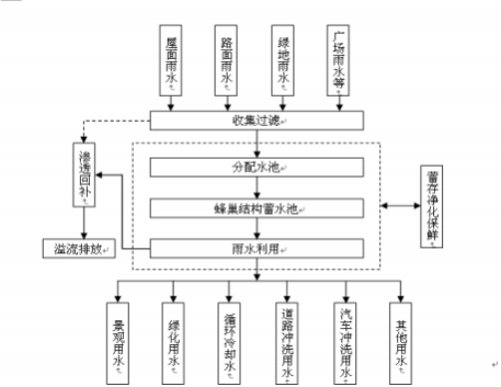 補”、“溢流排放”四個子系統(tǒng)組成,如下圖所示。雨水分別通過由砂基透水 磚鋪裝形成的海綿型吸水地面,以及砂基透水路緣石、濾水溝及溝蓋板等構成 的“面式排水”結構收集過濾;過濾后的雨水由導水管流入分配水池,進而流 入蜂巢結構蓄水池,雨水經過蜂巢結構的層層過濾,得以凈化,可用于景觀、 綠化、道路沖洗等方面;過量雨水溢流進入“滲透回補”子系統(tǒng),每個滲水井 既起到滯留調蓄作用,同時又能起到滲透回補地下水作用;當降雨量超過上述 系統(tǒng)的容量時,超量溢流的雨水則通過連通到市政管網的已有管道,實現(xiàn)錯峰排放。