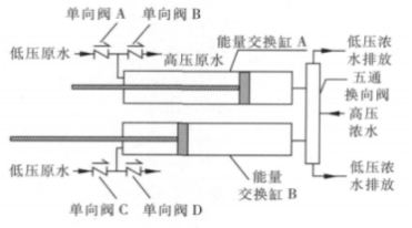 低壓原水從單向閥 A 或單向閥 C 進(jìn)入能量回收裝置,充滿(mǎn)能量交換缸 A 或 能量交換缸 B;高壓濃水從五通換向閥進(jìn)入能量回收裝置,當(dāng)五通換向閥使高 壓濃水與能量交換缸 A 連通時(shí),高壓濃水將能量傳遞給低壓原水,實(shí)現(xiàn)能量交 換,高壓原水從單向閥 B 進(jìn)入反滲透膜壓力容器進(jìn)行脫鹽處理;待將能量交換 缸 A 中的原水全部加壓送至反滲透系統(tǒng)后,五通換向閥,將高壓濃水與能量交 換缸 B 連通,重復(fù)上述能量交換過(guò)程,同時(shí)能量交換缸 A 中低壓原水進(jìn)入,排 出低壓濃水。兩個(gè)能量交換缸交替進(jìn)行高壓濃水與低壓原水的能量交換,實(shí)現(xiàn) 將低壓原水連續(xù)增壓送至反滲透系統(tǒng)進(jìn)行脫鹽處理。